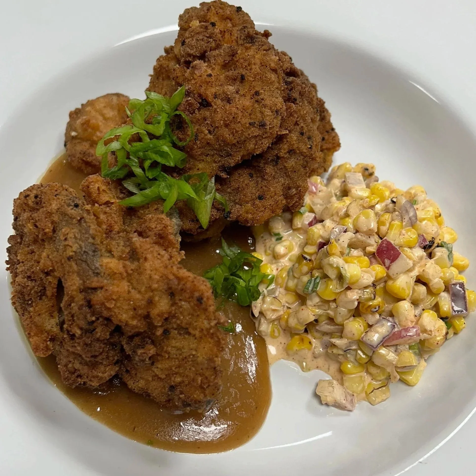 cajun fried cauliflower, sweet heat glaze, blackened ranch, sweet potato fries, LTO - a LV classic